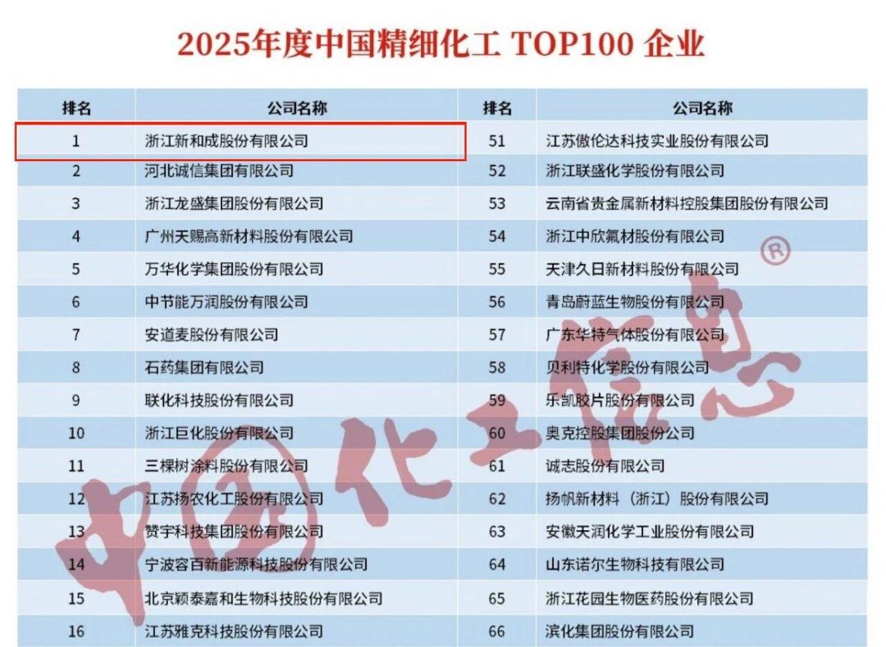 新和成同時(shí)榮膺“2025年度中國精細化工TOP100企業(yè)”“2025年度中國精細化工創(chuàng )新發(fā)展TOP10企業(yè)榜首。此次登頂,既是對新和成綜合實(shí)力的高度認可,也彰顯了新和成在經(jīng)營(yíng)管理、創(chuàng )新和綠色發(fā)展等方面的硬核實(shí)力。